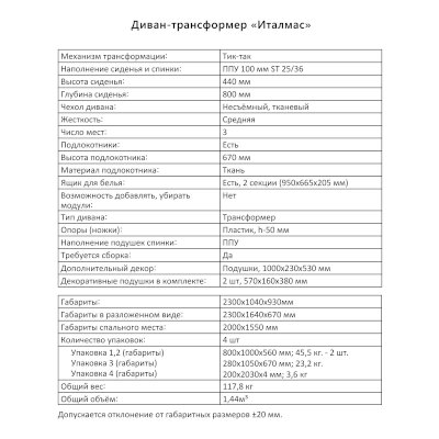 Диван-трансформер Италмас (Аквилон) продается в интернет-магазине mebelin-lyubercyi.ru по цене 73 376 руб. Есть доставка по Люберцам и Московской области. Возможность подъема на этаж и сборки уточняйте у менеджера по телефону 8(800)505-27-11.
