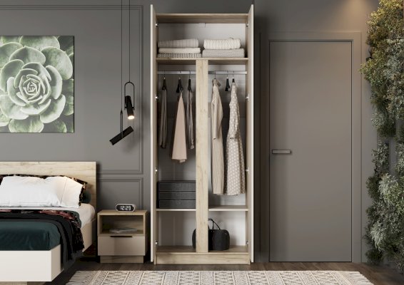 Двухстворчатый шкаф ЛАВЕНА — идеальное решение для организации пространства в спальне, прихожей или гардеробной. Этот стильный и функциональный шкаф сочетает в себе продуманную конструкцию и современный дизайн, создавая уют и порядок в вашем доме.